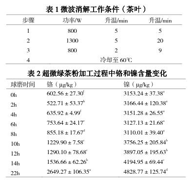 血[6];過(guò)量的鎳可引起炎癥、癌癥、癥、系統(tǒng)紊亂、降低生育能力、致畸和致突變等[7];鉻雖是人體必需的微量元素,但高鉻的食用也會(huì)引起不適[8]。超微綠茶粉是將達(dá)到綠色標(biāo)準(zhǔn)的綠茶茶葉,經(jīng)超微粉碎形成 200 目(74μm)甚至達(dá)到 1000 目(12μm)以上的綠茶超微細(xì)粉[9-10]?,F(xiàn)階段我國(guó)企業(yè)大多采用球磨方式加工超微綠茶粉,在球磨加工過(guò)程中,茶葉被粉碎的同時(shí),研磨材料本身也會(huì)發(fā)生變化,從而可能給超微綠茶粉帶來(lái)重金屬污染。另外,與傳統(tǒng)茶葉不同的是,超微綠茶粉屬于茶葉深加工范疇,常被以全組分形式加入到食品和化妝品中[11],又因其中的重金屬元素應(yīng)滿足《食品標(biāo)準(zhǔn)食品中污染物限量》和《茶葉中鉻、鎘、汞、砷及氟化物限量》對(duì)茶葉中重金屬限量要求[12-13],因此應(yīng)對(duì)超微綠茶粉加工過(guò)程中重金屬污染給予關(guān)注,但目前對(duì)超微綠茶粉加工過(guò)程中的重金屬含量變化未見(jiàn)報(bào)道。本文對(duì)球磨加工過(guò)程中超微綠茶粉的重金屬含量進(jìn)行檢測(cè)分析,同時(shí),采用三組球磨材料不銹鋼球-不銹鋼罐、氧化鋯球-不銹鋼罐、瑪瑙球-尼龍罐對(duì)超微綠茶粉進(jìn)行加工,通過(guò)重金屬元素鉻和鎳的檢測(cè),并結(jié)合粒徑分析,為尋找合適的球磨材料提供依據(jù)。