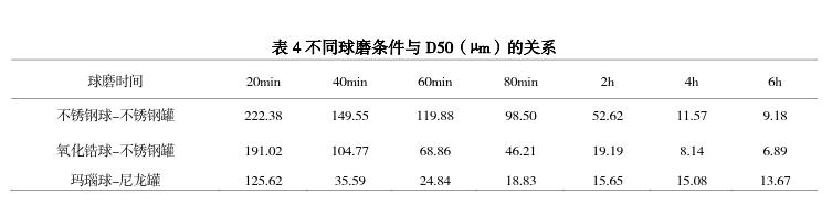 在不銹鋼球-不銹鋼罐、氧化鋯球-不銹鋼罐、瑪瑙球-尼龍罐三種研磨材料組合中,超微茶粉粒徑為 35~55μm 時(shí),使用瑪瑙球-尼龍罐球磨的茶樣中鉻和鎳的含量均小于 5.0mg/kg;粒徑為 10μ
