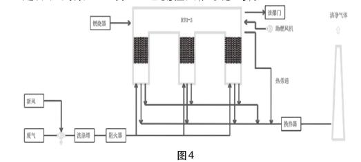 在廢氣處理項目中,3塔RTO一般與風機,噴淋塔,阻火器,煙囪等組成一個系統(tǒng)。RTO一般正壓運行,風機應選擇變頻控制適應不同工況。前置噴淋塔可吸收酸、堿性廢氣,減少對RTO爐的腐蝕。后置噴淋塔可進一步降低廢氣排放量。有的有熱回收需求,可在末端增設(shè)熱交換器,產(chǎn)生熱水和熱氣回用。煙囪可根據(jù)項目需要設(shè)計,一般至少為15米高,煙囪越高對廢氣擴散有利,成本也越高。系統(tǒng)的組成需要根據(jù)項目來設(shè)定,圖4為某RTO項目工藝流程圖(供參考)。